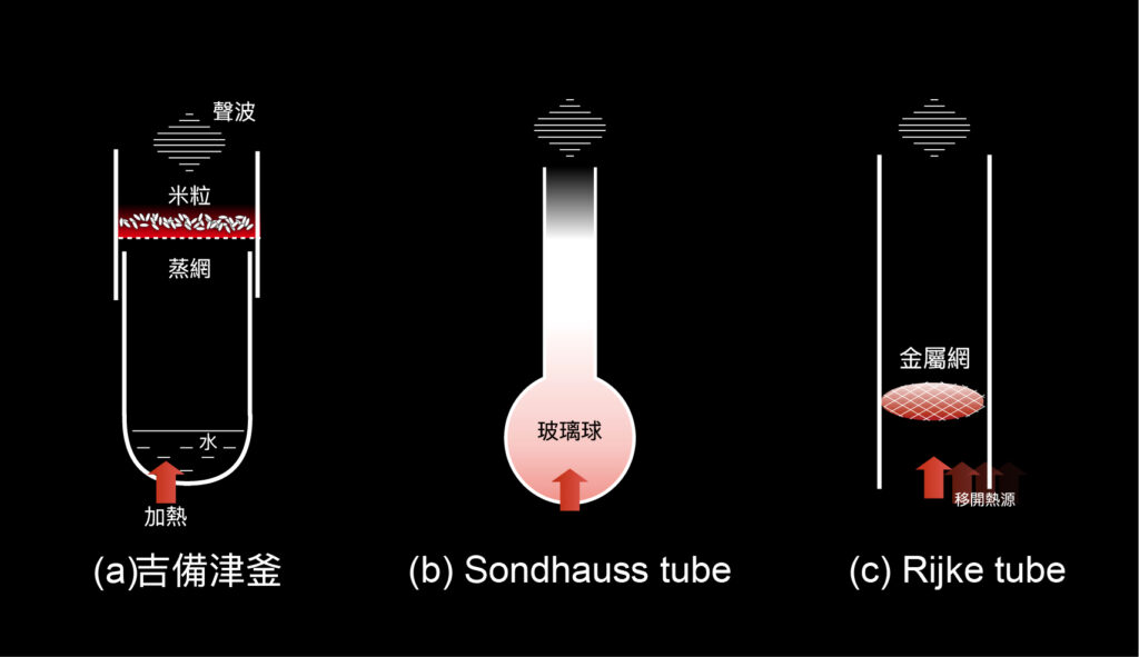 熱聲現象最早的文獻紀錄,是在日本18世紀志怪小說《雨月物語》中「吉備津釜」篇提及的釜鳴。吉備津釜的構造如圖1(a)所示,灑滿米粒的蒸網置於長筒狀鐵釜上,釜內沸水的水蒸氣加熱了米粒構成的微小流道,引發自激發聲現象。19世紀歐洲亦有紀錄,玻璃工匠偶然發現到,將常溫玻璃管的一端吹製熔融玻璃球時,不時有聲波發生,Sondhauss率先系統性地嘗試實驗調查此現象,此熱聲裝置因此命名為Sondhauss tube,如圖1(b)。同時期,Rijke在兩端開放管內部的四分之一處置入金屬網並加熱之,也發現了聲波產生,而有如圖1(c)的Rijke tube。
