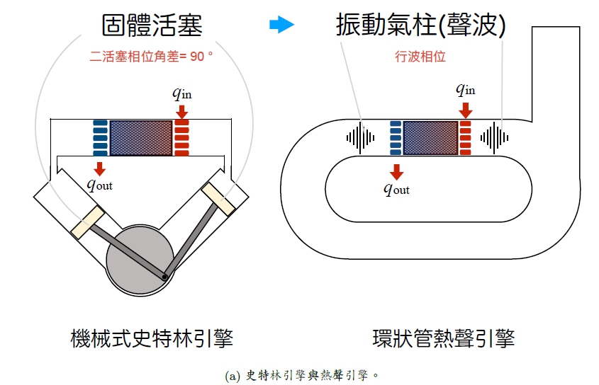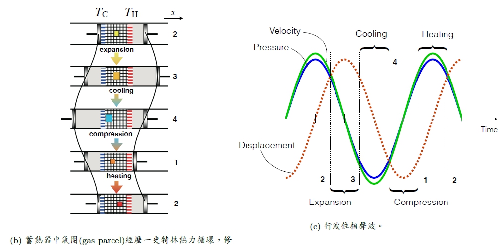 理論上,運行高效率熱力學循環的熱機之一有史特靈引擎,為外燃機,Alpha型史特靈熱機的形式如圖3(a)所示,以二個相位差90度的固體活塞的往復運動做功。本研究室主要研究之熱聲引擎亦是外燃機,不同於機械式引擎,是以聲音的振動壓力波形式輸出功。 並且,若以聲波的行波成分轉換能量,其熱力學過程可近似於史特靈循環。3(a)是機械式史特靈引擎與行波型熱聲引擎對比, 由圖3(a)可知,在環形構造及蓄熱器、高低溫熱交換器架構下,熱聲引擎可說是精簡曲柄活塞後的史特靈引擎。如圖3(b)所示,由微觀視點觀察蓄熱器中往復振動的氣塊(gas parcel),可知因二活塞往復會使壓力振動與位移 振動形成90度的相位差, 意即氣塊的壓力與流速是以同相位振動,等同於從冷端傳到熱端的行波聲波。因此,當如圖3(c) 的行波聲波傳遞於一有軸向溫度梯度的蓄熱器,氣塊便在往復振動過程當中經歷一系列熱力學過程,進而近似於史特靈循環。